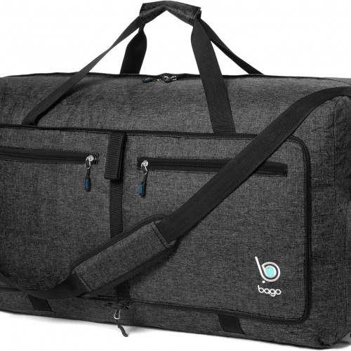 Bago Large Foldable Duffel Bags for Traveling Women & Men – 80L Packable Duffle Bag for Travel with Shoe Compartment – Water Repellant, Heavy Duty, Lightweight Folding & Collapsible (SnowBlack)