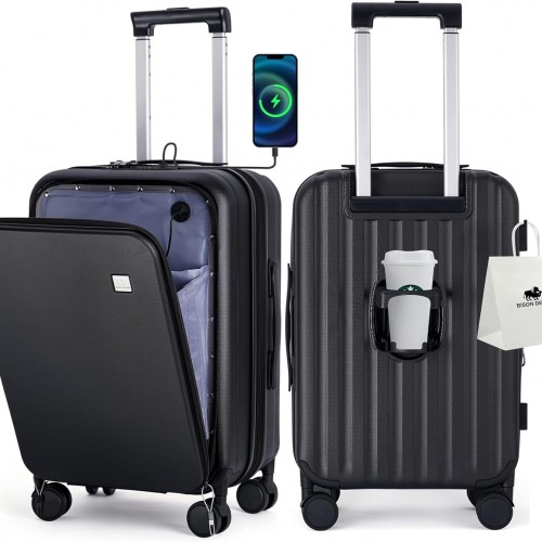 BISON DENIM 20 Inch Carry On Luggage, PC Lightweight Hardside Expandable Carry-On Luggage Airline Approved With Spinner Wheels, Front Compartment, Cup Holde, TSA-approved Lock, USB Port, Black