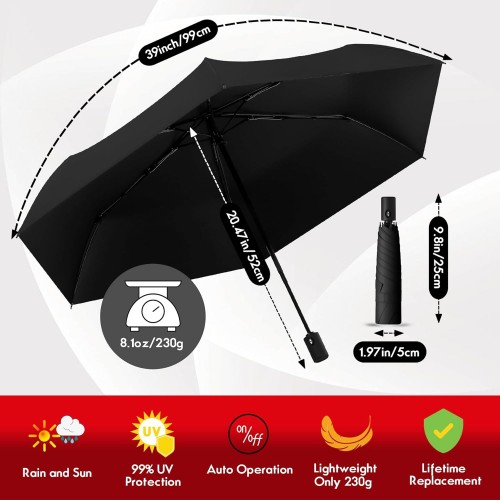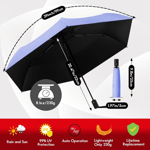 Auto Open Close Umbrella – Ultra Light Compact Travel & Backpack Size for Women and Men, UPF 50+ Eco-Friendly Sun Protection & Windproof Rain Umbrella with UV Defense