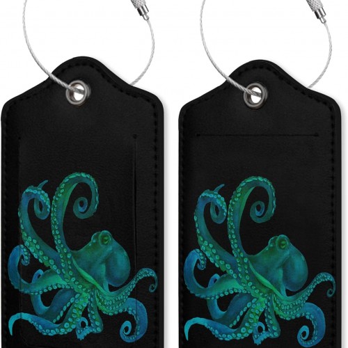 2 Pack PU Leahter Luggage Tag with Stainless Steel Loop,Green Octopus Luggage Tag Travel Suitcase Labels with Privacy Cover ID Label Quickly Spot for Bags & Baggage