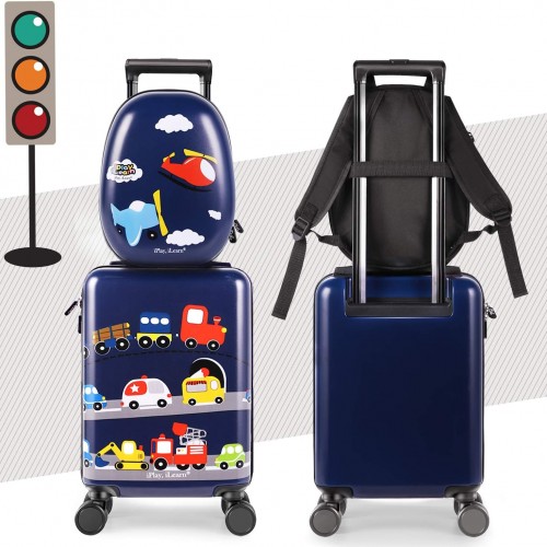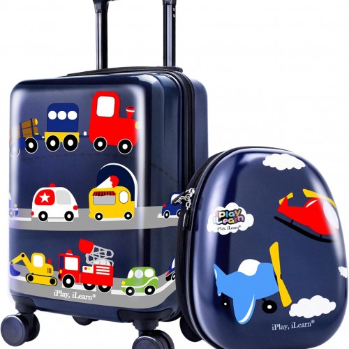 iPlay, iLearn Airplane Kids Luggage, Boys Carry On Suitcase, 18″ Hardside Travel Luggage Set W/Backpack, Toddler Rolling Luggage W/ 4 Spinner Wheels, Children Holiday Birthday Gift