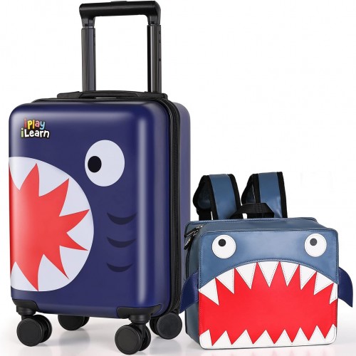 iPlay, iLearn Shark Kids Luggage, Boys Carry on Suitcase, 18″ Hardside Travel Luggage Set W/Backpack, Toddlers Rolling Luggage W/ 4 Spinner Wheels, Children Holiday Birthday Gifts