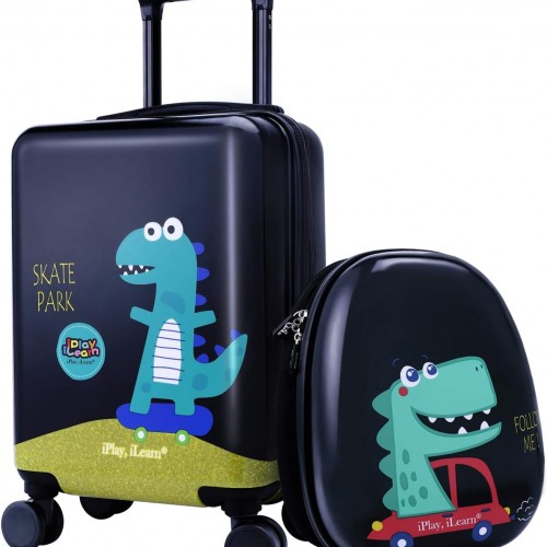iPlay, iLearn Dinosaur Kids Luggage, Boy Carry on Suitcase, 18″ Hardside Travel Luggage Set W/Backpack, Toddler Rolling Luggage W/ 4 Spinner Wheels, Children Holiday Birthday Gift
