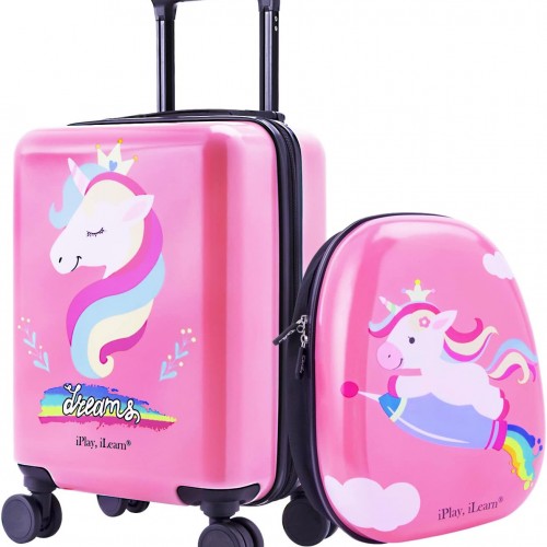 iPlay, iLearn Unicorn Kids Luggage, Girls Carry on Suitcase, 18″ Hardside Travel Luggage Set W/Backpack, Toddler Rolling Luggage W/ 4 Spinner Wheels, Children Holiday Birthday Gift