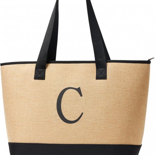 KALIDI Woven Tote Bag for Women, Lightweigh Monogram Beach Bag with Zipper & Sand-Proof Canvas Base, Personalized Gift