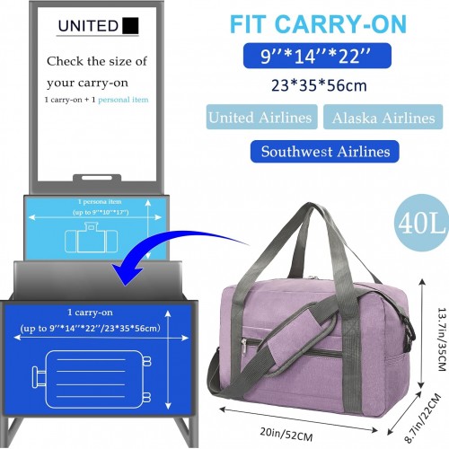 Foldable Carry on Luggage Bag 22x14x9 Personal Item Bag for Airplanes Travel Duffel Bag for Women and Men (40L, Purple)