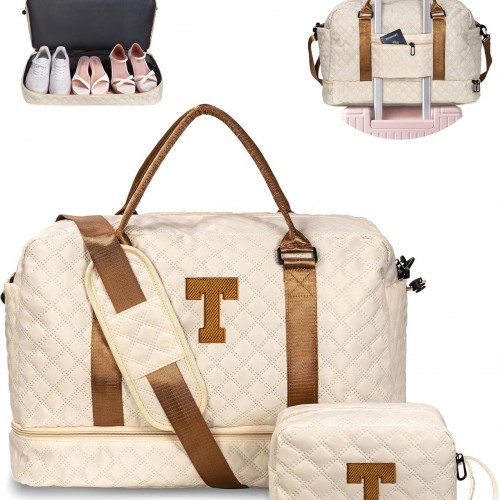 Beach Essentials 11 12 13 14 15 16 17 18 Year Old Girls Gifts-Initial Duffle Bag with Shoe Compartment, Personalized Weekender Bag, Travel Bag with Makeup Bag,Birthday Gift for Her (Letter T)