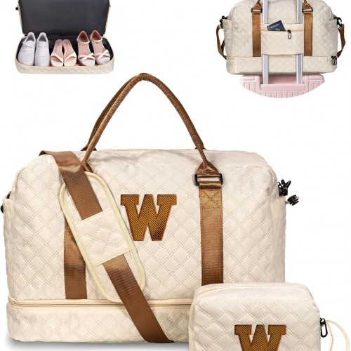Initial Duffle Travel Bag, Personalized Weekender Bag with Shoulder Strap, Monogram Overnight Bag for Women Wet Pocket, Letter Travel Bag with Makeup Bag Gifts for Friends Female (Letter W)