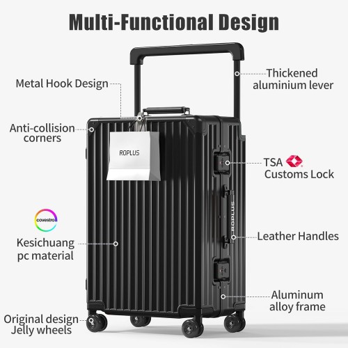 Aluminium Frame Carry on Luggage with Smooth Jelly Wheels, Hardside Zipperless Rolling Suitcase with TSA Lock (Pure Black, 21-Inch)