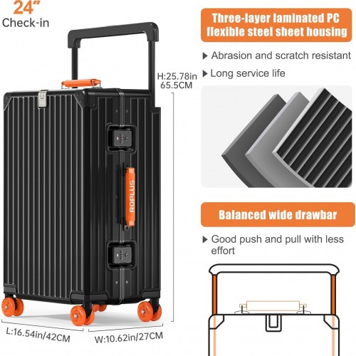 Aluminium Frame Checked-Luggage with Smooth Jelly Wheels, Hardside Zipperless Rolling Suitcase with TSA Lock (BlackOrange, 24-Inch)
