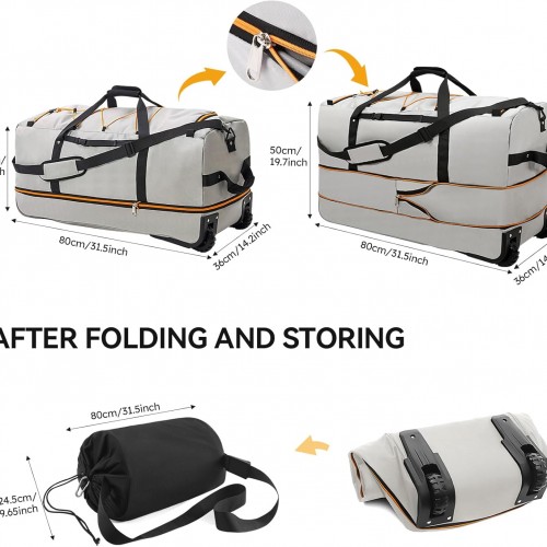 CONTAIL 32″ Soft-Sided Rolling Duffle Bag with 2 Wheels,Expandable from 110L to 140L, Foldable Travel Duffel with Multiple Compartments,Grey
