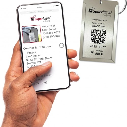 Dynotag® Web Enabled Smart Aluminum Convertible Luggage ID Tag + Braided Steel Loop, with DynoIQ™ & Lifetime Recovery Service (Cool Silver)