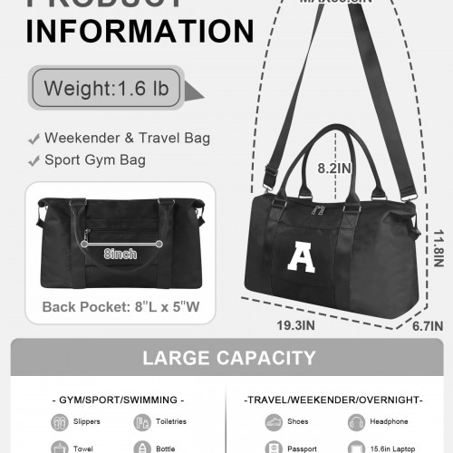 Initial Travel Duffel Bag Sports Gym Bag for Boys Teen Birthday Gifts,Black Personalized Weekender Bag Carry On Tote Bags for Men,Waterproof Overnight Luggage Bag Airplane Travel Essentials(Letter A)