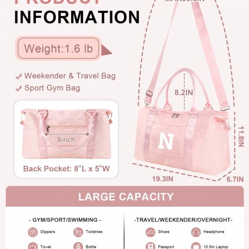 Initial Travel Duffel Bag Sports Gym Bag for Girls Teen Birthday Gifts,Pink Personalized Weekender Bag Carry On Tote Bags for Women Men,Waterproof Overnight Luggage Bag with Trolley Sleeve(Letter N)