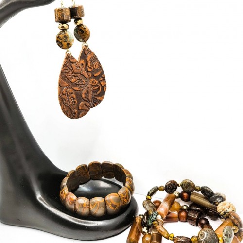 Made with rondelle bronzite gemstones with brown lace agate tubes, and Natural Rainforest Rhyolite Jasper beads, Accented beads are gold brushed pyrite with natural jasper arrowhead pendant. If you are going for an earth tone look, you can accomplish it with set ! The Banded Jasper bracelets give your arm a stack look.