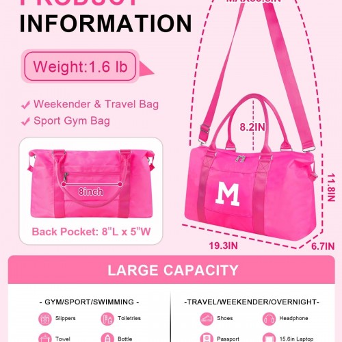 Overnight Bag for Kids Teen Girls Weekender Dance Bag Birthday Graduation Gifts,Initial Travel Duffel Bag Sports Gym Bag Personalized Weekender Bag Carry On Bags Preppy Gifts for Women(Hot Pink, M)