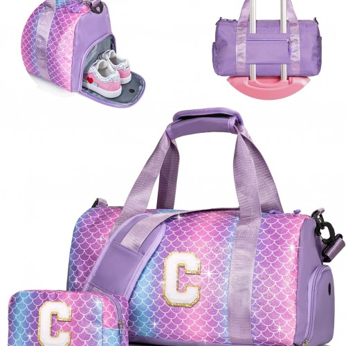 Preppy Gifts-Girl Gym Bag with Shoe Compartment, Kid Personalized Weekender Overnight Bags, Initial Travel Tote with Makeup Pouch, Gift for 3 4 5 6 7 8 9 10 11 12 Year Old Girls (Letter S)