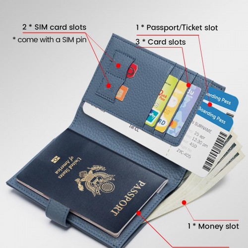RFID Slim Passport Holder for Man & Women, Compact Leather Passport Wallet with Card Holders SIM Slots, Zippered Coins Pocket and Cash Holder Travel Passport Cover Case, Dark Blue