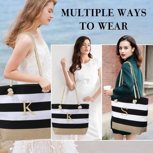 YOOLIFE Initial Canvas Waterproof Beach Tote Bag Zipper Personalized Gifts for Women Her Birthday Travel Beach Essential
