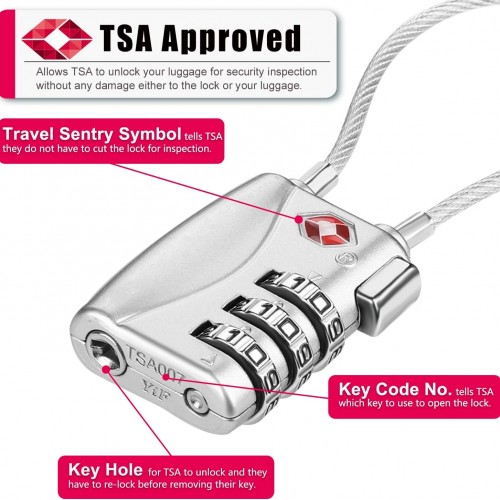 ZHEGE TSA Lock for Luggage 3 Digit Combination Cable Lock with Alloy Body for Suitcase, Baggage, Backpack, Pistol Case (Silver)